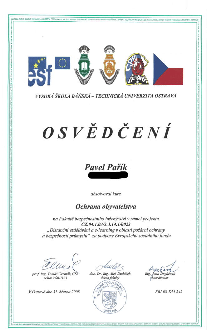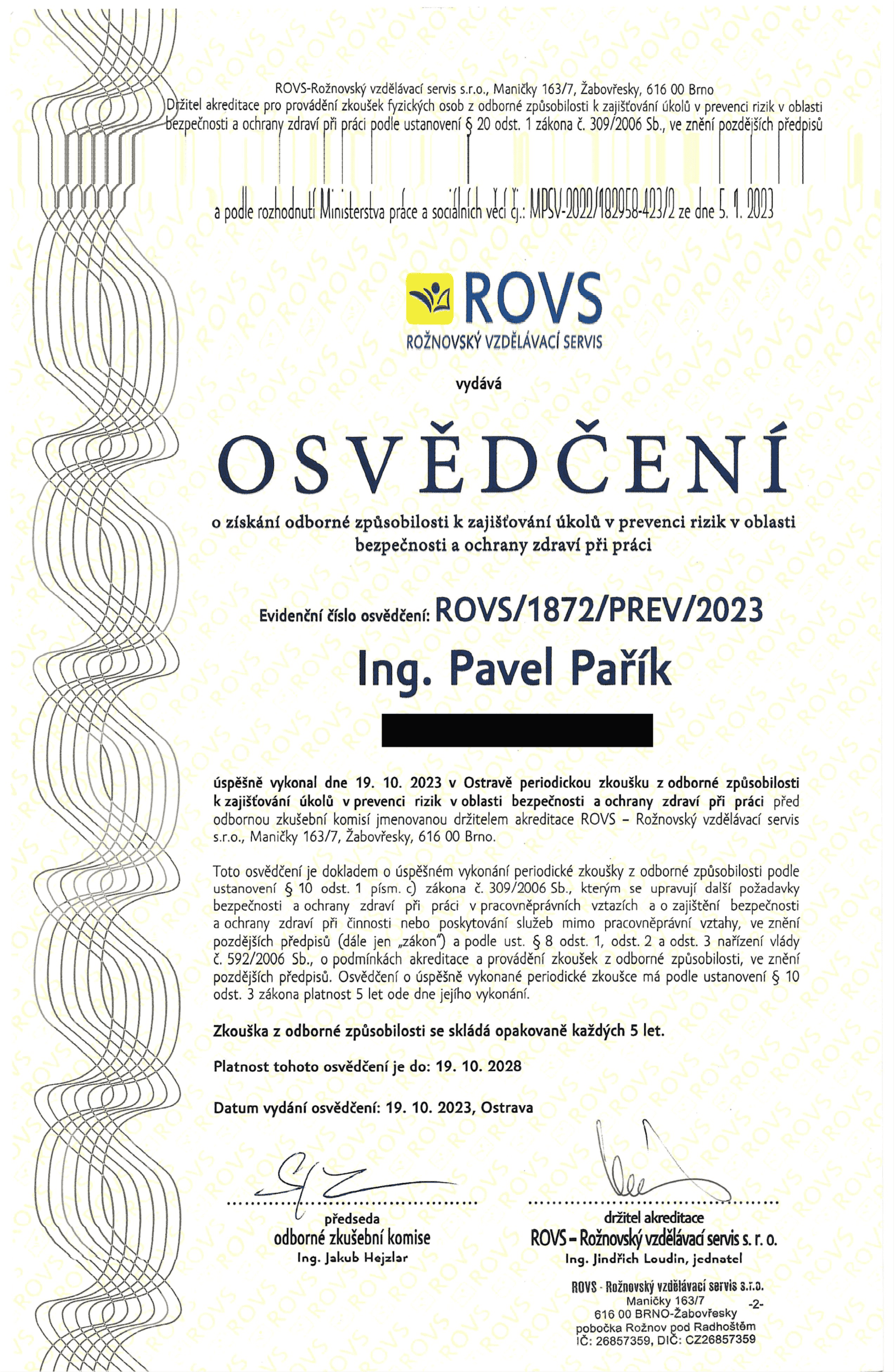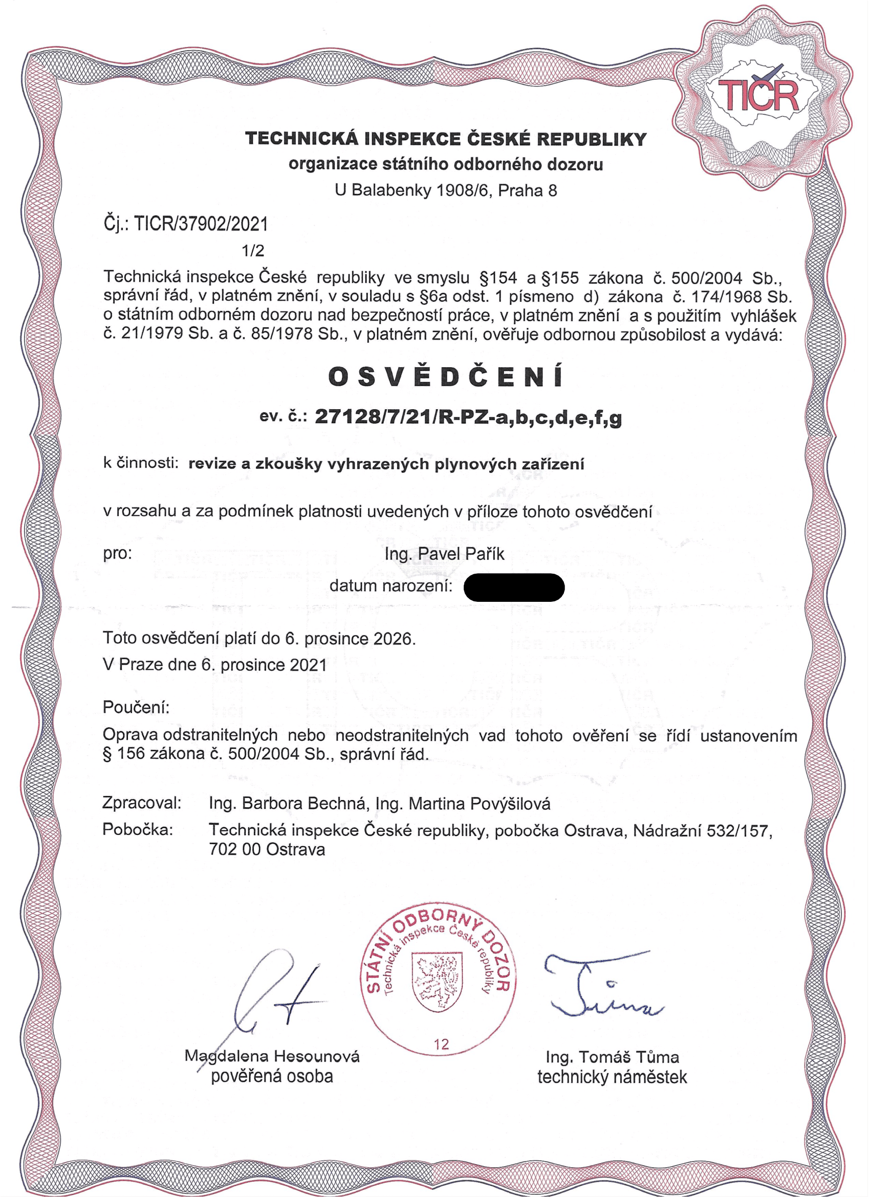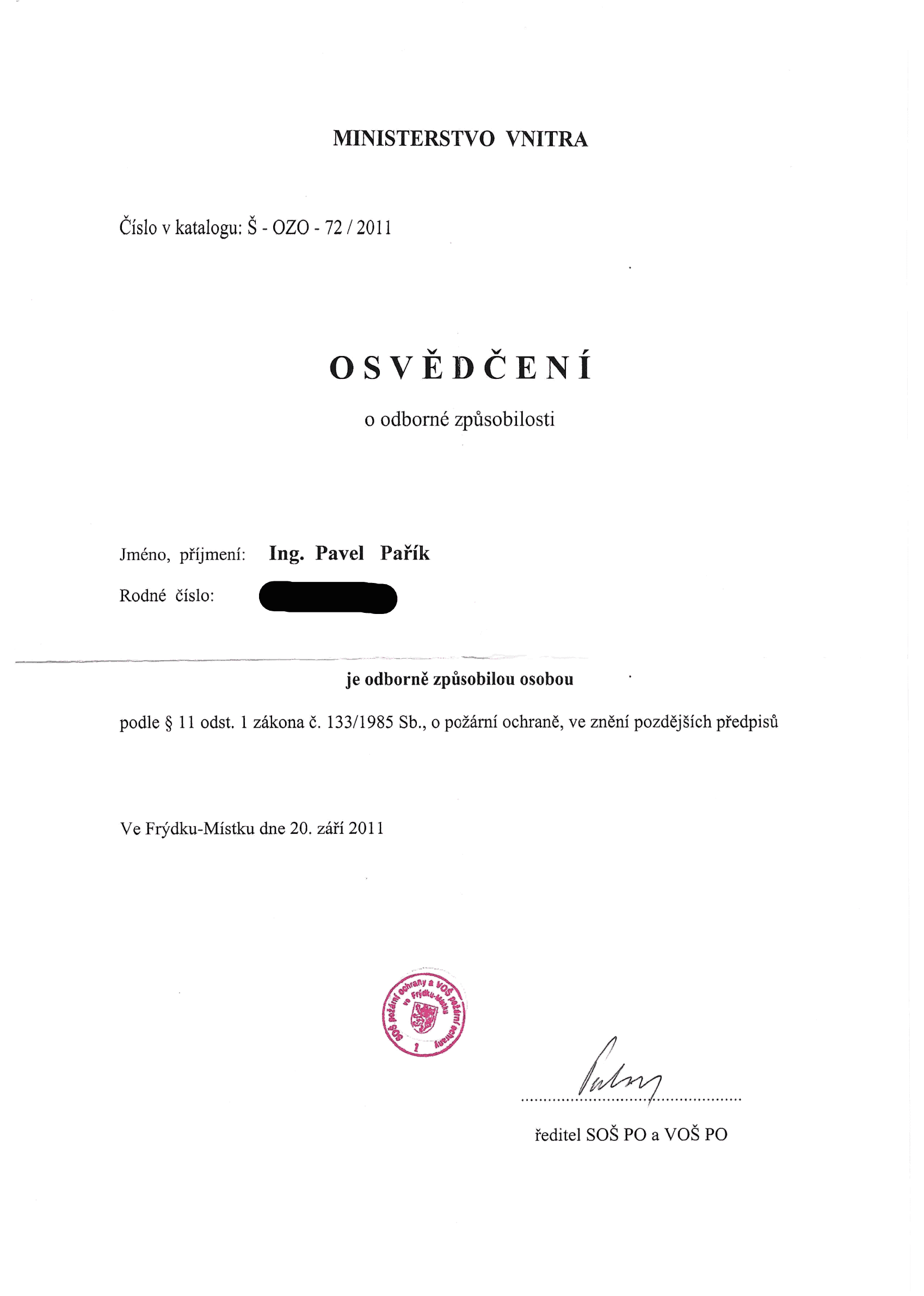 Mám také odbornou způsobilost v BOZP dle zákona č. 309/2006 Sb., odbornou způsobilost v PO dle § 11 zákona č. 133/1985 Sb. a působím jako revizní technik VTZ tlakových a plynových zařízení. Dále mám také zkoušky revizního technika VTZ tlakových (NA, PK3, HK3) a VTZ plynových (a, b c, d, e, f, g).